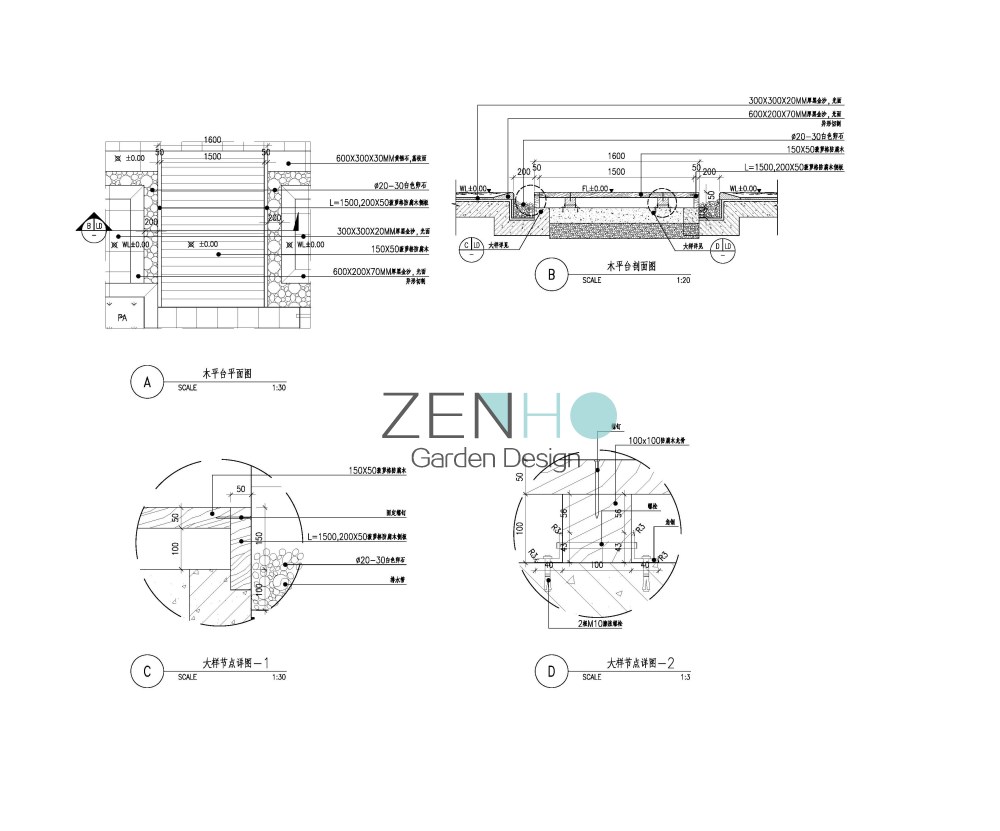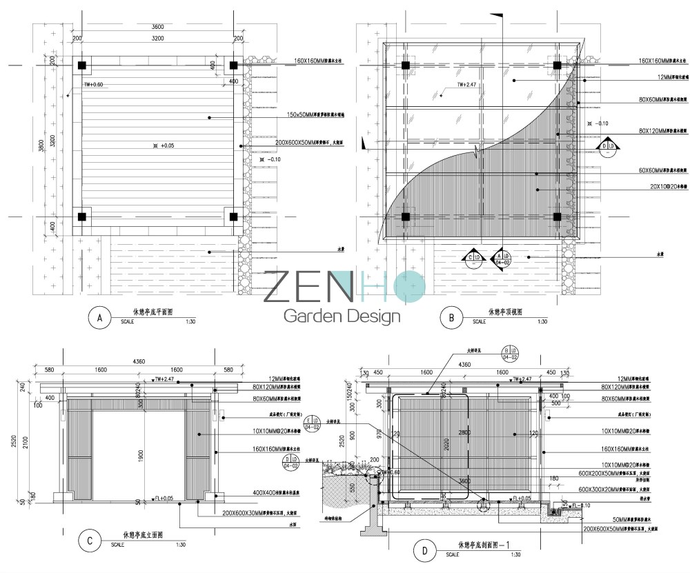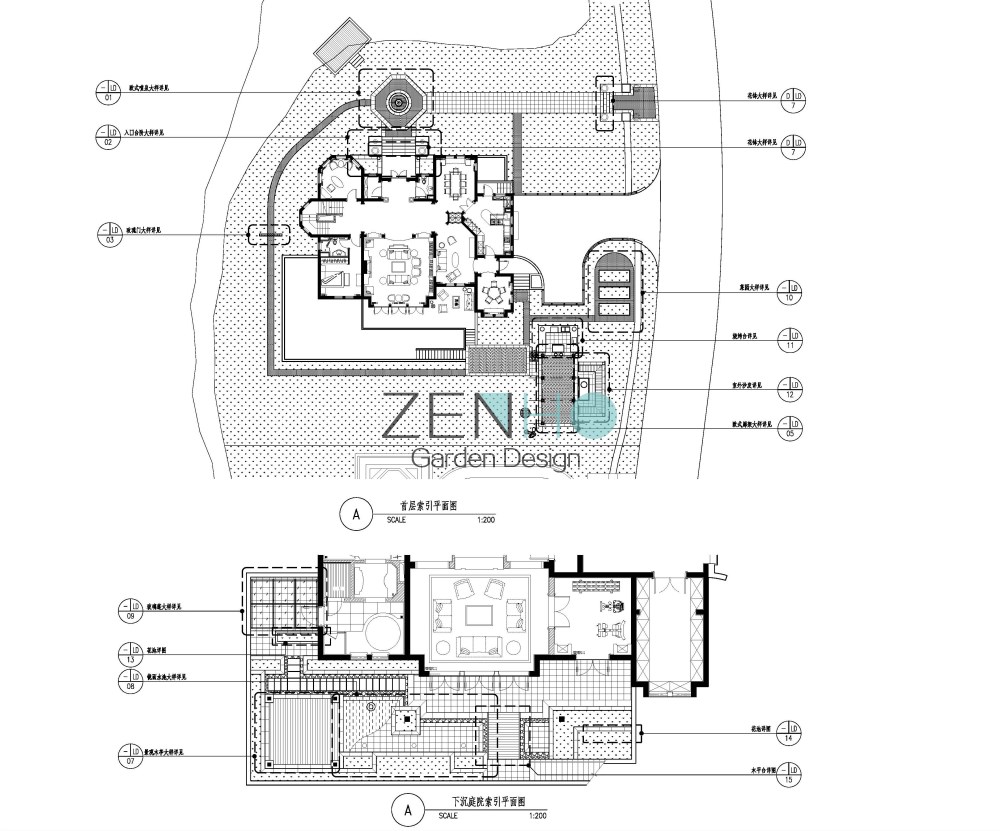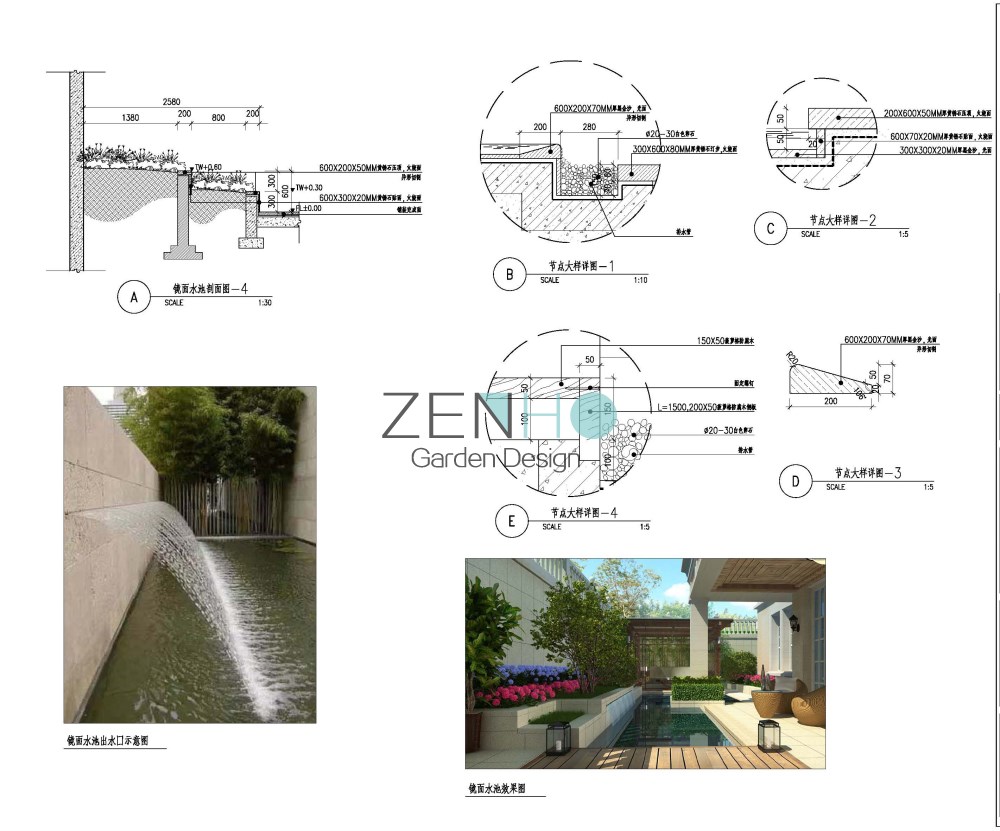 景观设计施工图案例展示具体内容包括: Ⅰ、为硬、软景施工提供详图的全套设计图纸。 Ⅱ、协助甲方编制硬景、软景工程精度安排。 Ⅲ、提供景观工程造价概算。 Ⅳ、按设计周期要求提交下列详图的硬景设计文件,供施工之用。包括: ·硬质景观详图和施工图(包括各园林小品的立面图/剖面图,重点铺装图,详细的园景节点大样图、结构图等); · 景观指引图及定位图;· 标高设计图;· 局部平面图和剖面图;· 地面排水及灌溉图;· 照明图;· 水、电施工图; · 软景元素包括以下内容:乔木和灌木;草地和地被植物;土方工程的斜坡等;特殊的排水要求;特殊的移植规范和图则。 · 制备及编制材料表,植物表及有关的工料规范。